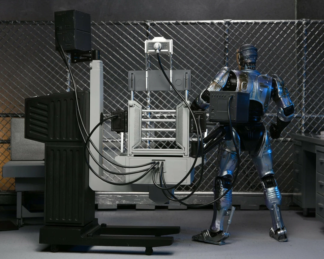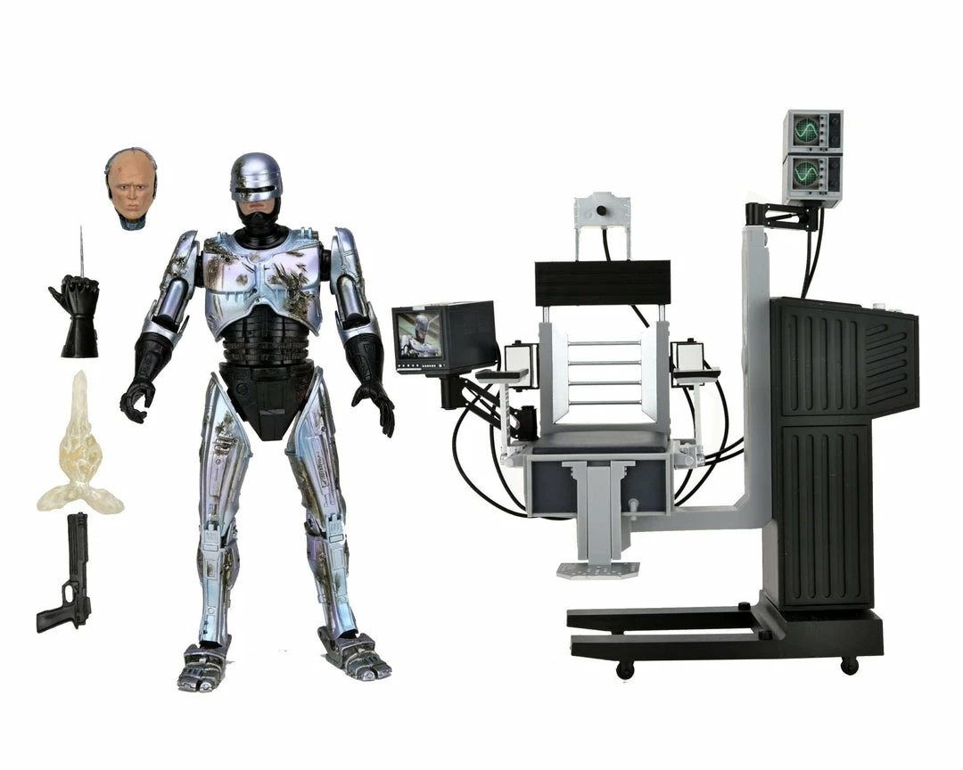 Part man. Part machine. All cop. For the 35th anniversary of the cult classic movie RoboCop in 2022, the crime fighter from future Detroit gets the Ultimate treatment from NECA! After fighting baddies all day, dock the 7” scale Ultimate Battle-Damaged RoboCop figure in the included screen-accurate chair with movable elements and loads of accessories.
