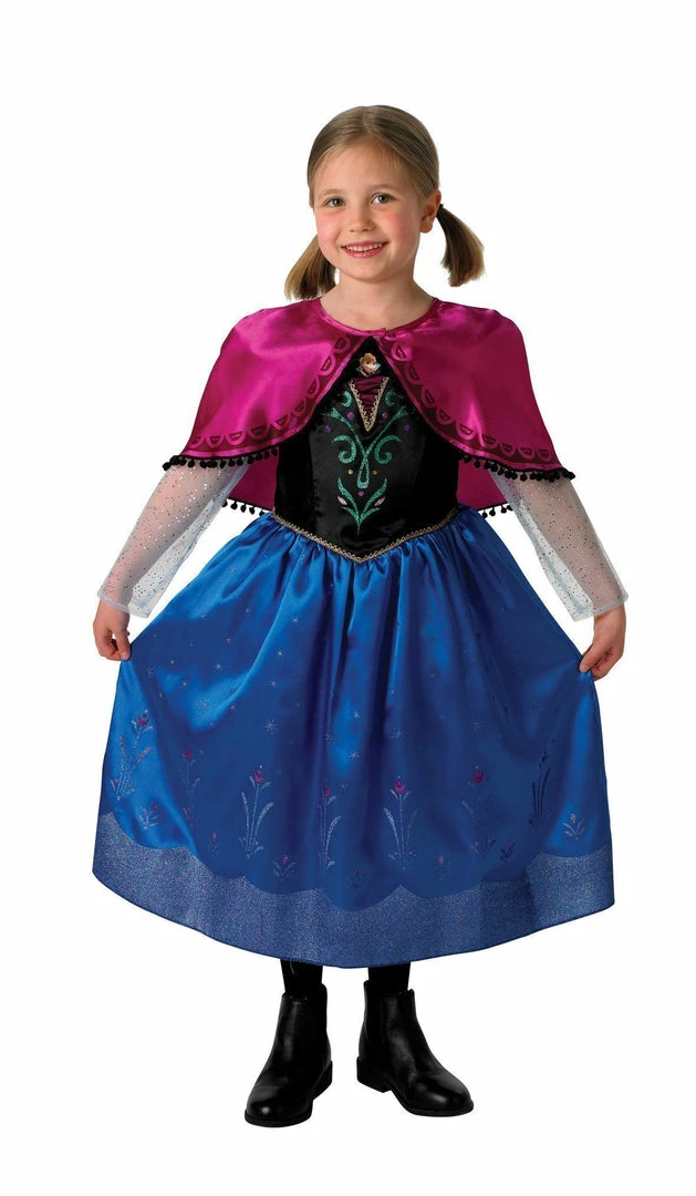 - Dress with velour bodice and satin middle panel. Satin panel with glitter print motif and ‘v’ cut out with gold trim. Character printed motif on satin ‘V’