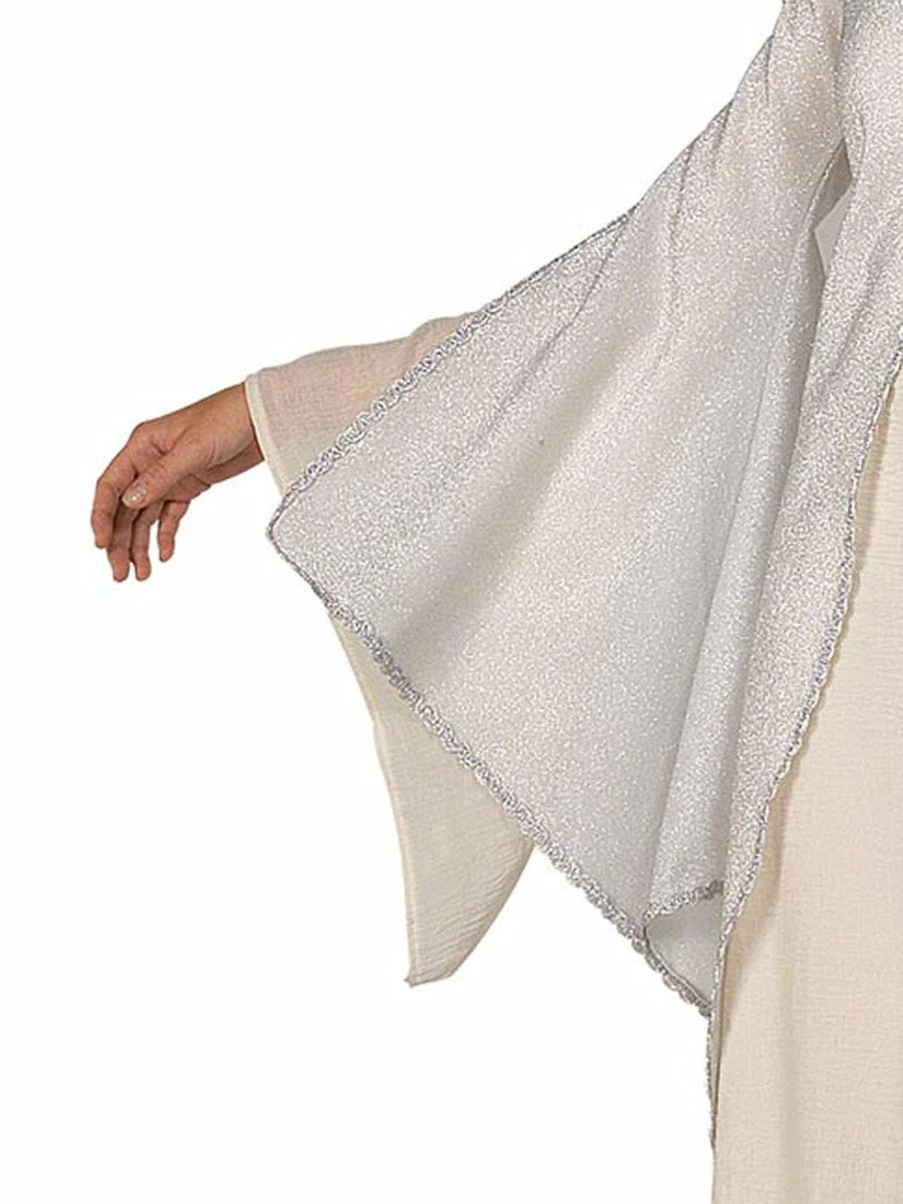 - Long white dress featuring sweetheart lacy neckline. Dress has glittery over-layer with silver highlights and silver embroidered trim