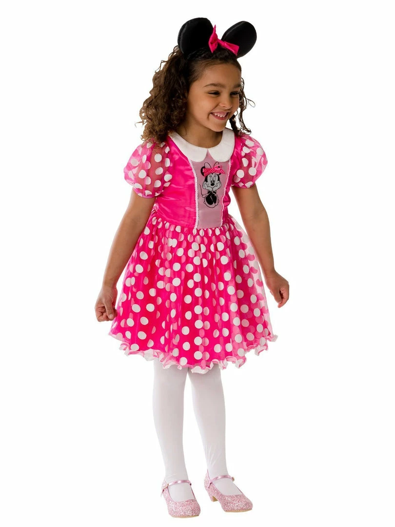 - Iconic Minnie Mouse dress with skirt featuring satin layer underneath and tulle overlay plus bodice with attached sheer puffy sleeves. Centre of bodice features Minnie Mouse print on satin material and satin lapels and ornate panelling