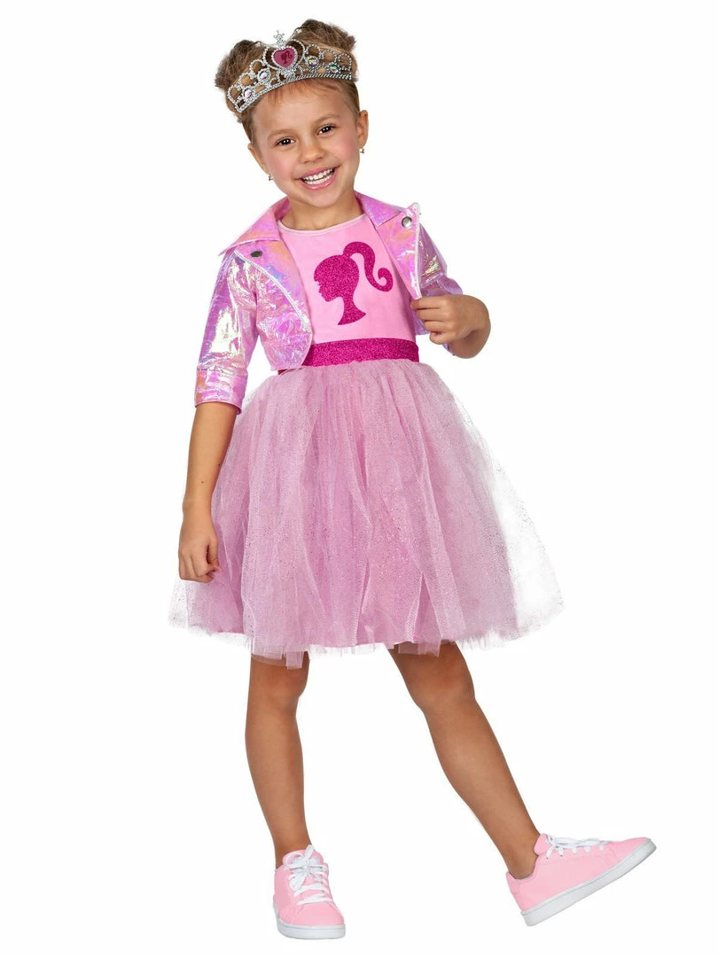 - Pink dress with iconic Barbie logo in glittery hot pink design on a velour bodice plus matching waist band attached to the skirt