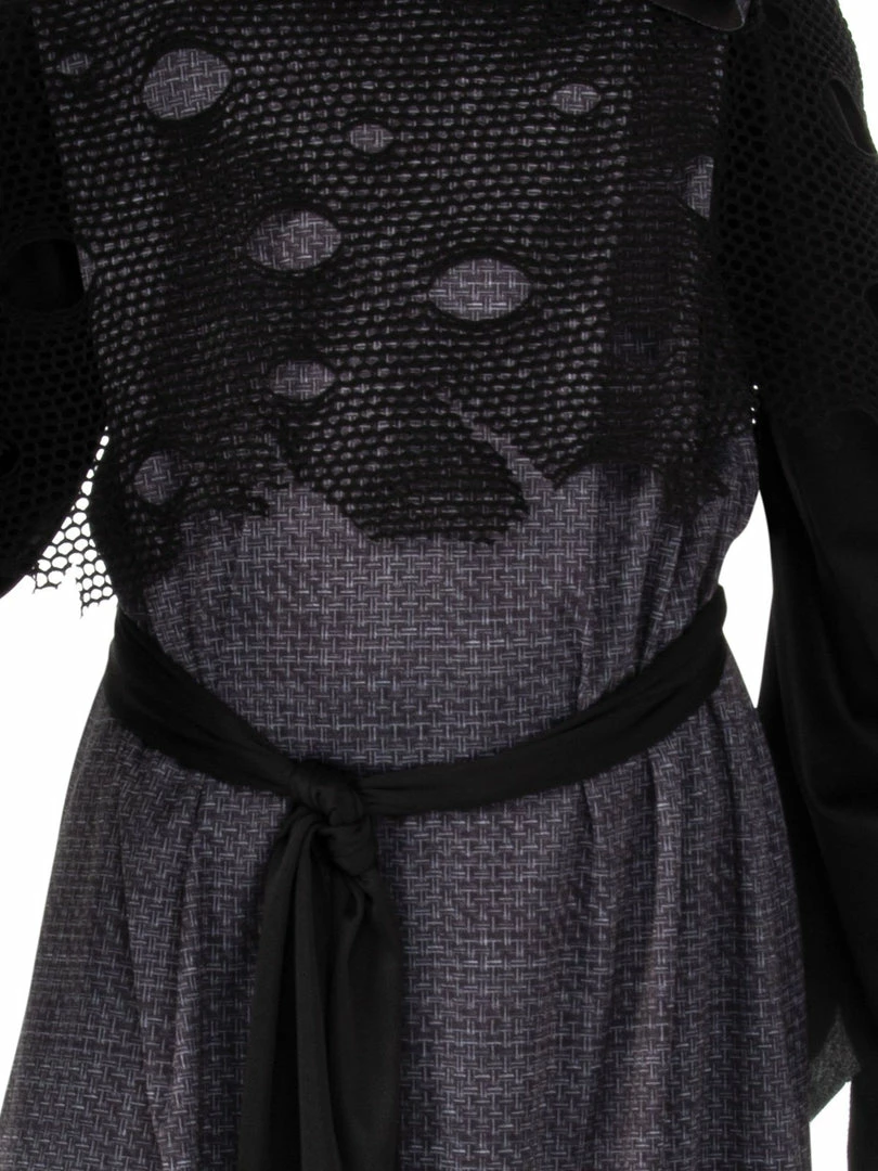 - Fishnet Hooded robe with tattered hem at base and trumpet sleeves