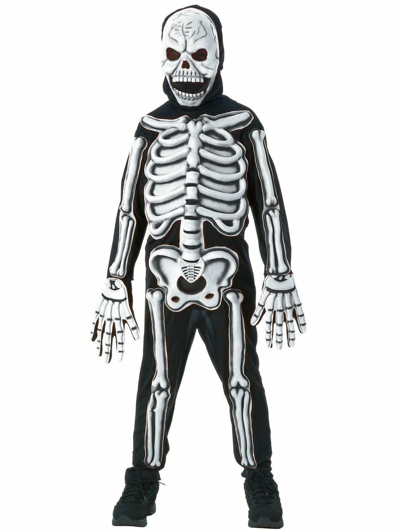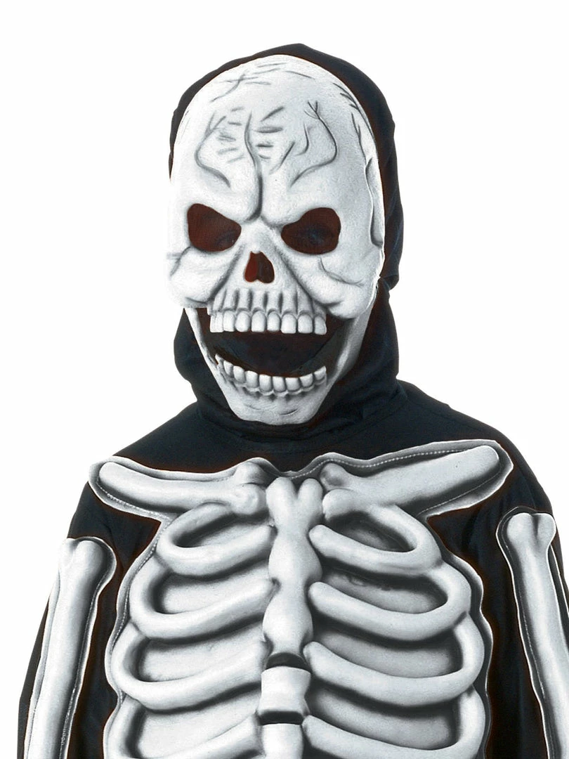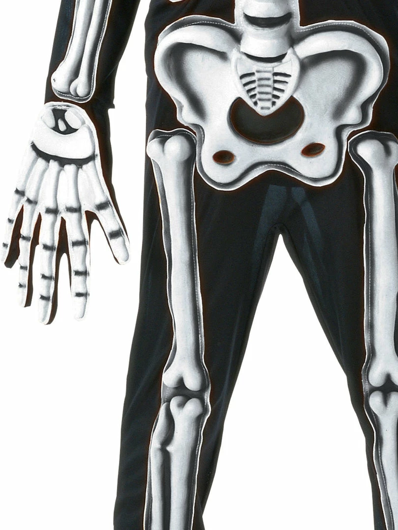 - All in one hooded jumpsuit with 3D moulded bones attached and digitally printed skeleton bones on front. Jumpsuit has glow in the dark elements on the bodice, mask and legs