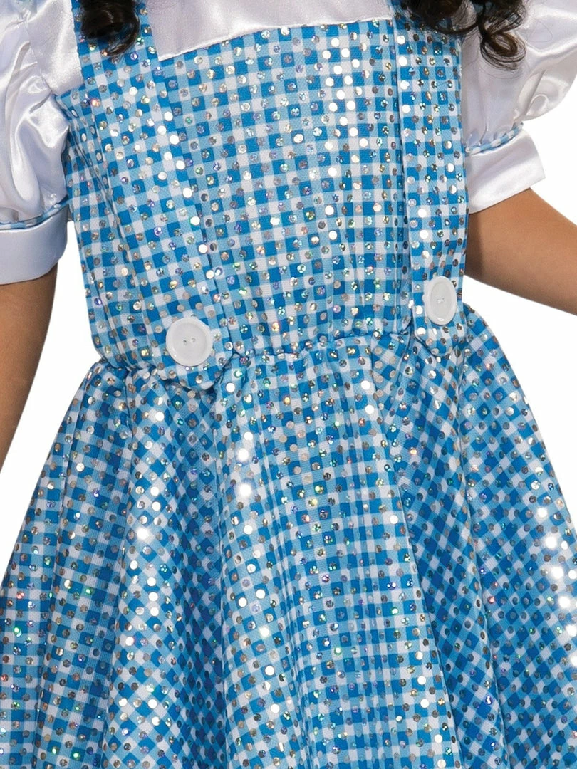 - Pinafore with Gingham printed sequin bodice and shoulder straps, plastic buttons at waistline, satin mock shirt with stand-away collar with trim