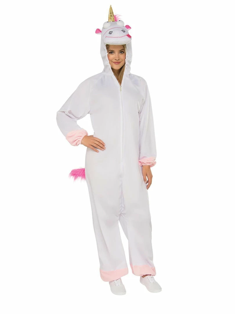 - Jumpsuit features 3D unicorn head with attached eyes and ears plus fibre filled gold unicorn horn and elastic around the face for comfort