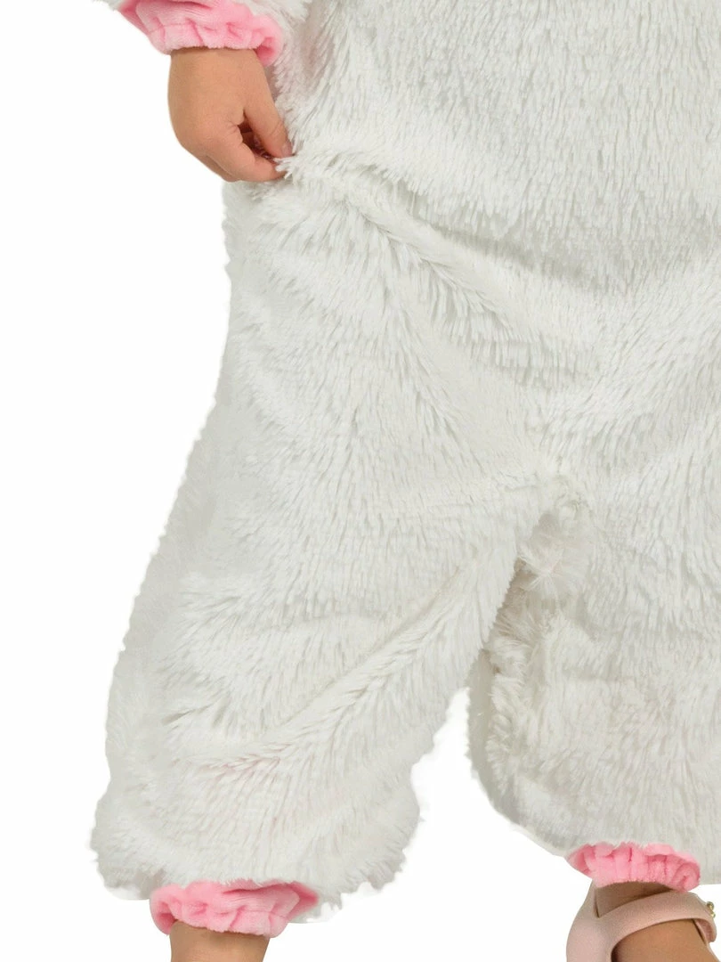- Polar fleece fluffy full body jumpsuit with rear velcro closures and attached tail and featuring elastic at cuffs and ankles