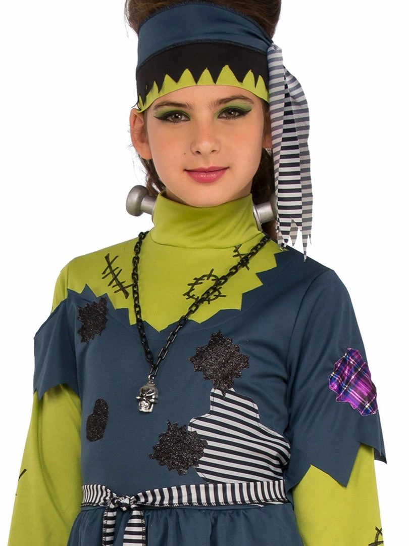 - Dress has long sleeves and printed stitch detail to look like wounds plus high collar with trademark plastic silver bolts at neck