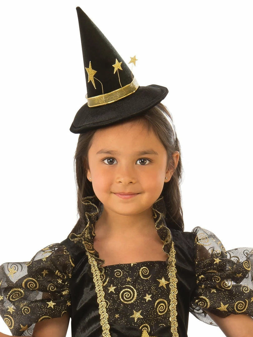 - Witches hat on headband with gold ribbon band and ornate gold star embellishments