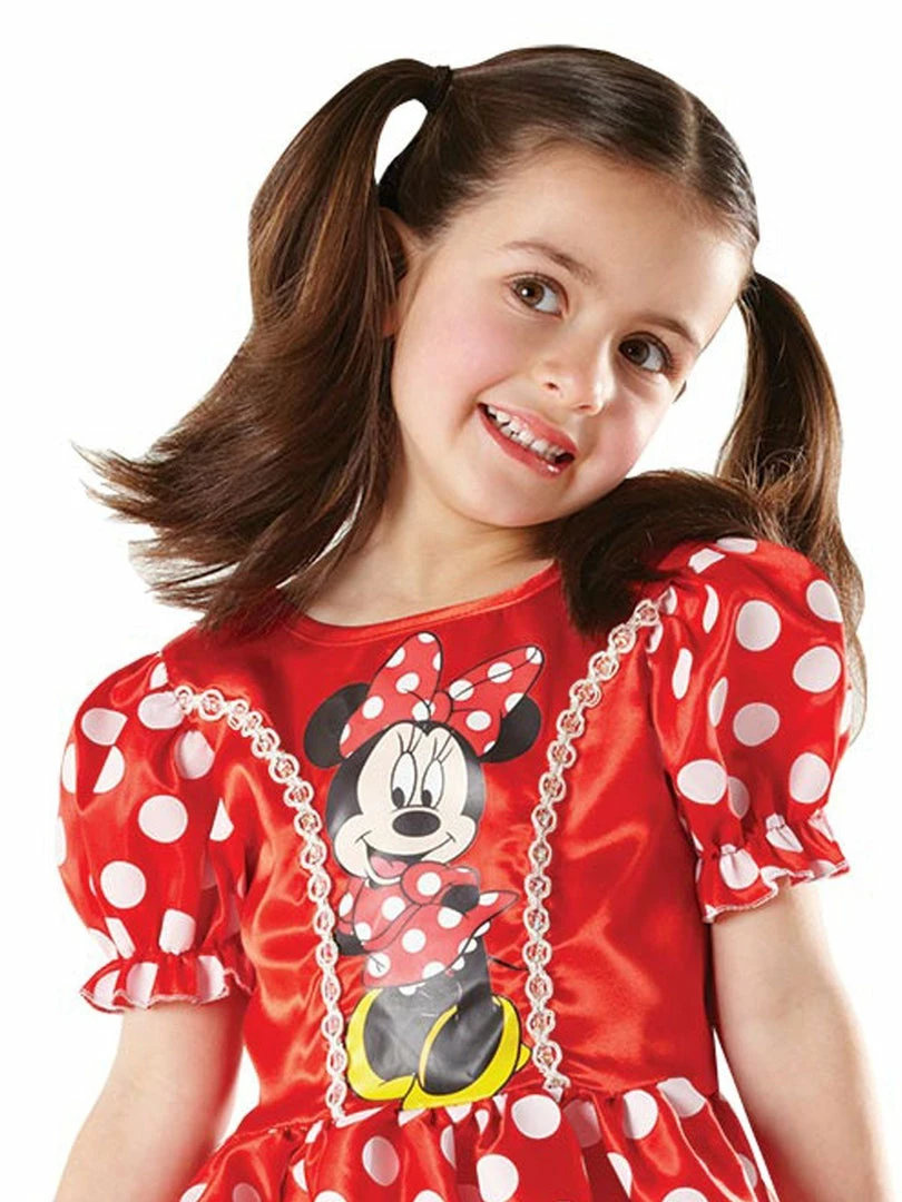 - Iconic Minnie Mouse dress made from satin material featuring trademark white spots on skirt and puffy sleeves. Centre of bodice features digitally printed Minnie Mouse print on satin material and stitched in panel