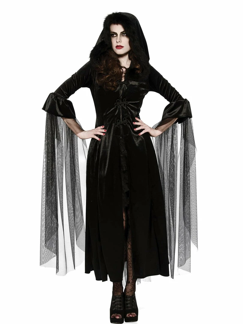 This gorgeous hooded robe will elevate any Halloween outfit to ‘best dressed’ territory! It comes in an elegantly flowing velvet, with tulle waterfall sleeves and a fur trimmed hood. Be THE Mistress of Midnight this year!