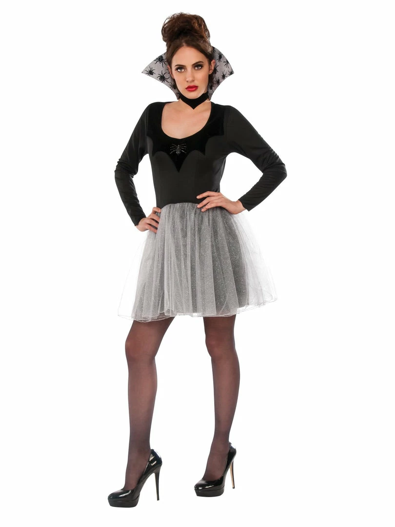 - Dress with rounded collar and spider print plus attached tulle skirt in glittery fabric