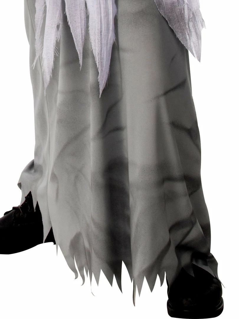 - Long digitally printed grey tunic with tattered tulle white robe overlay and tattered sleeves, plus attached grey hood