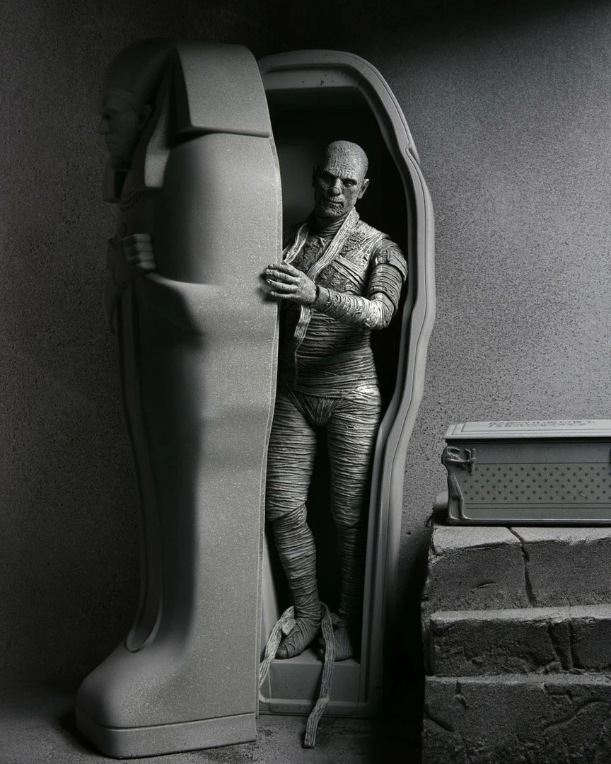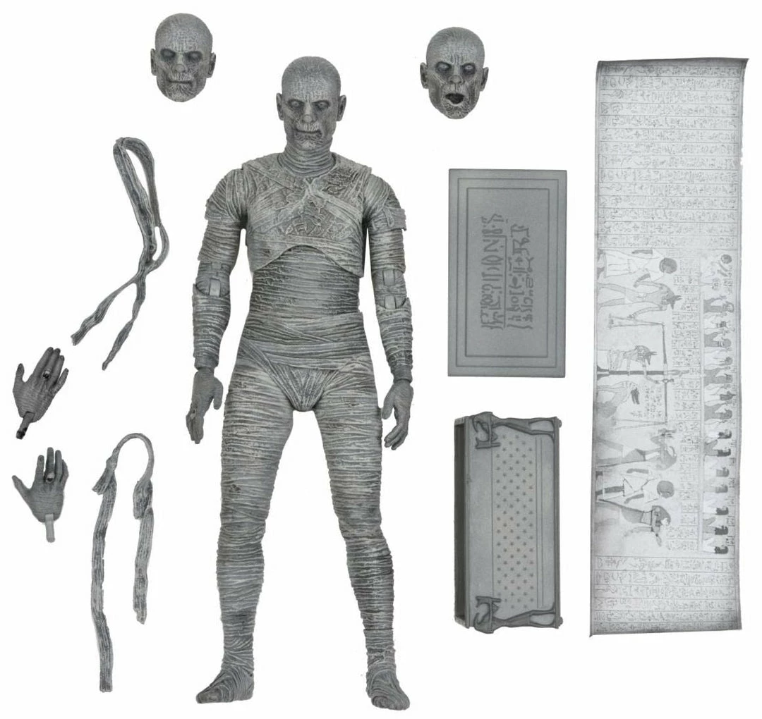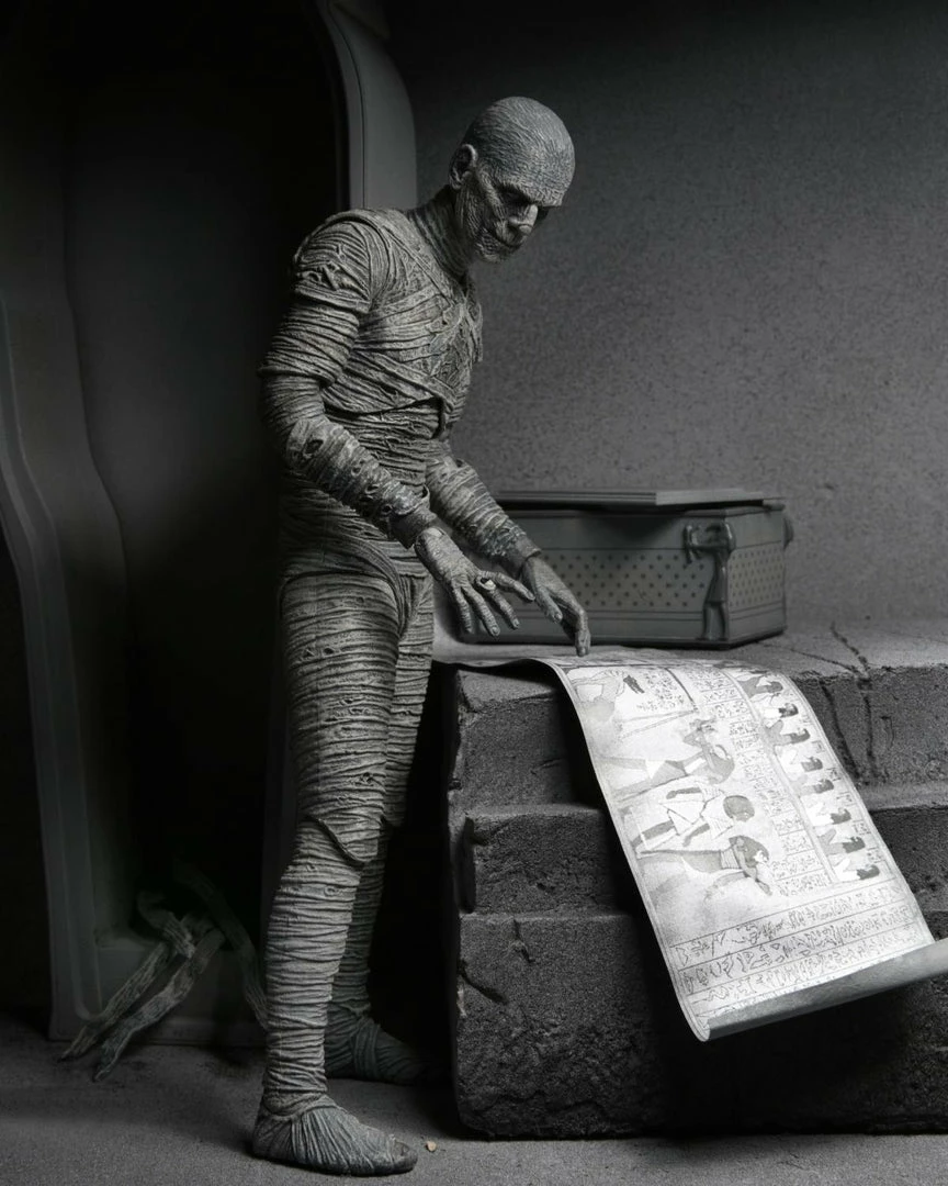 For the 90th anniversary of the extraordinary silver-screen classic, NECA presents The Mummy action figure in authentic black and white. In this Universal Monsters classic of horror, Boris Karloff shines as the ancient Mummy in a tale of love transcending death. The sculpt captures the intricate special effects make up that required eight hours to apply and two hours to remove.
