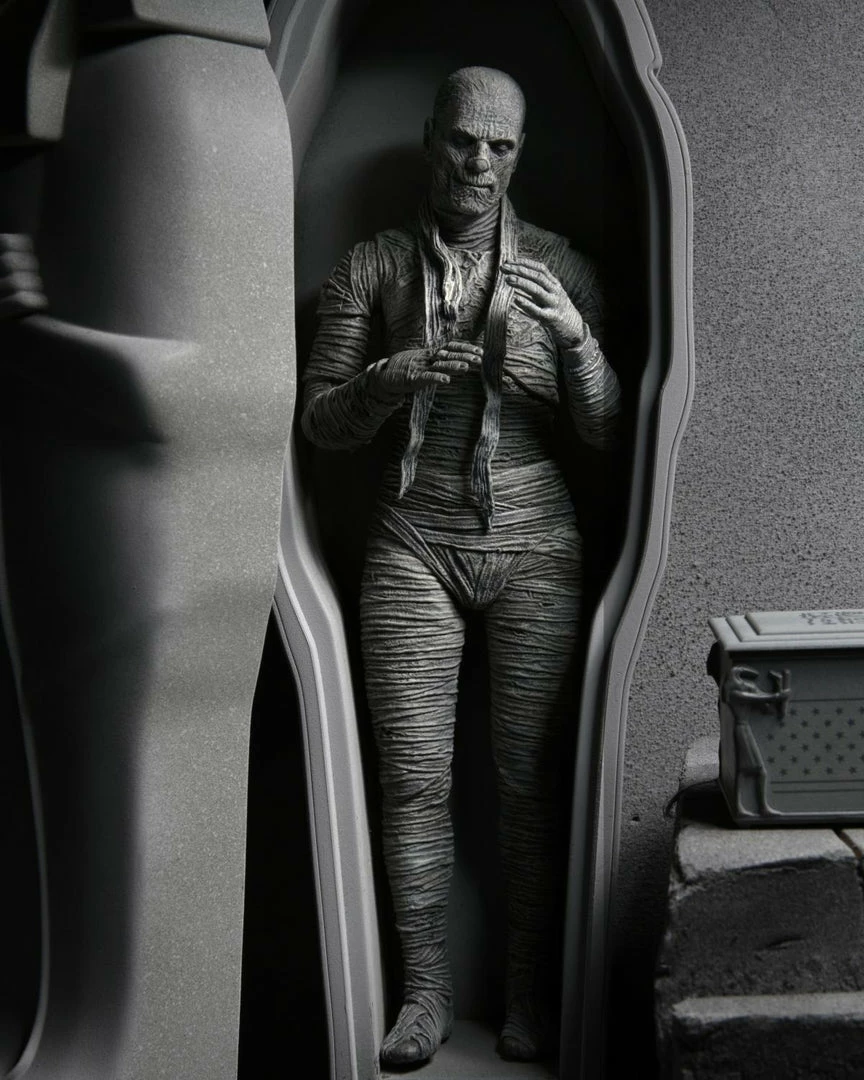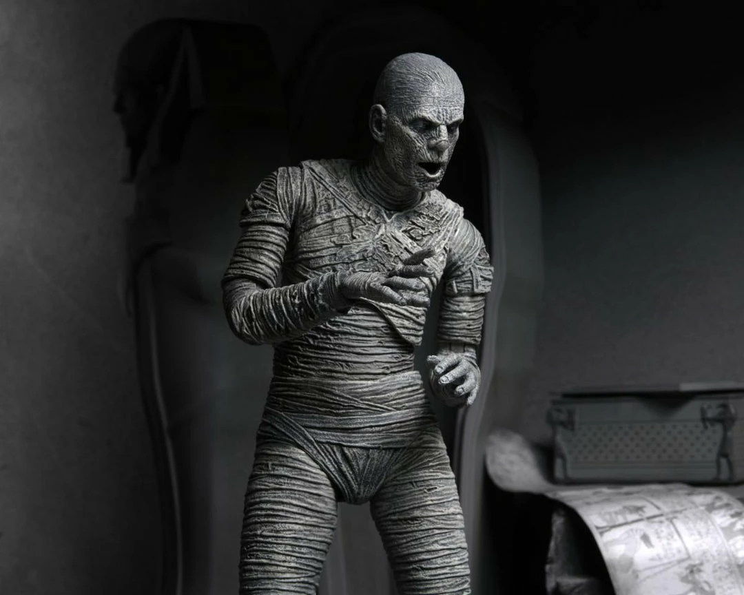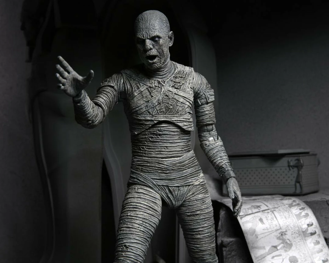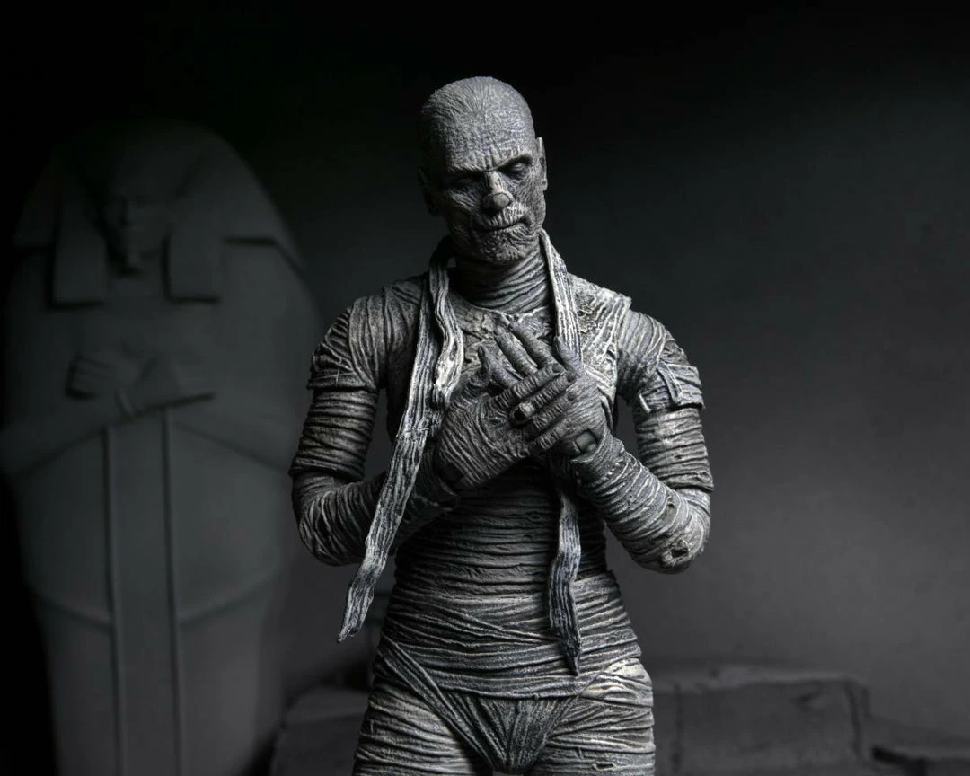 For the 90th anniversary of the extraordinary silver-screen classic, NECA presents The Mummy action figure in authentic black and white. In this Universal Monsters classic of horror, Boris Karloff shines as the ancient Mummy in a tale of love transcending death. The sculpt captures the intricate special effects make up that required eight hours to apply and two hours to remove.